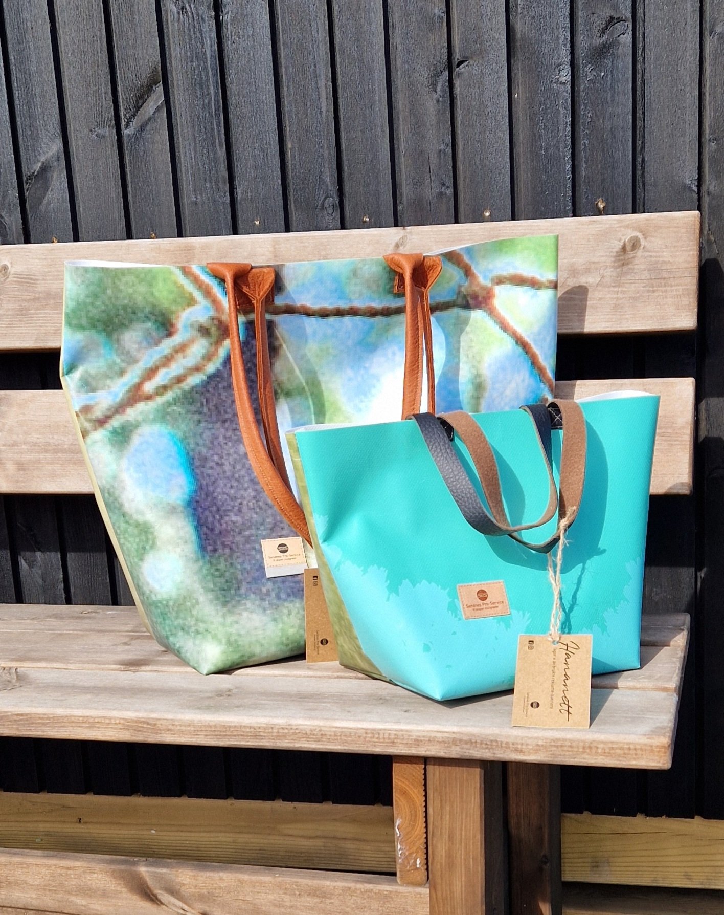 Et flott og solid handlenett, laget av slitesterke materialer som PVC og Mesh fra reklamebannere i distriktet. Bunnen har fått et forsterket lag i samme material.